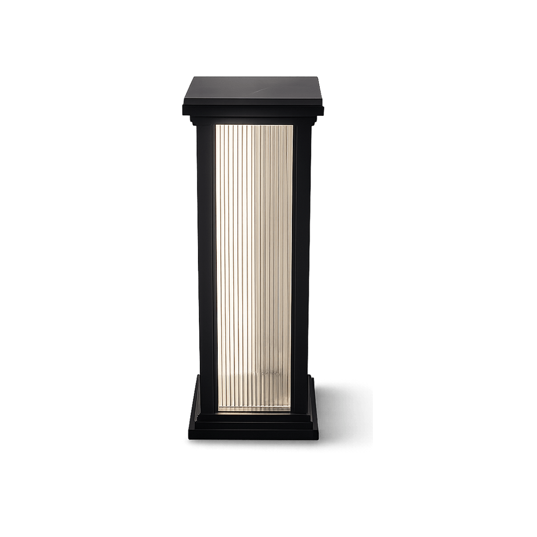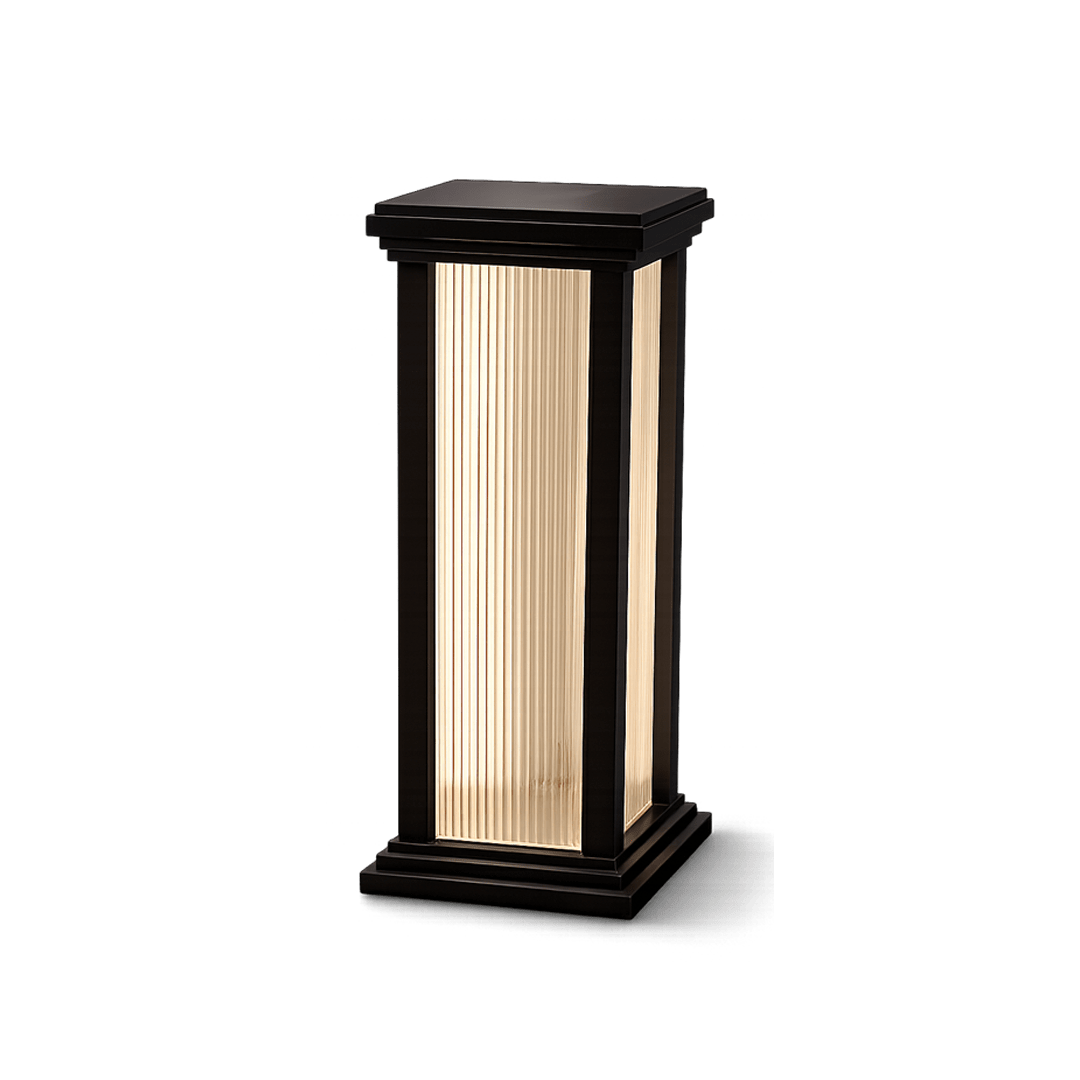 A refined pedestal featuring illuminated fluted glass panels framed in dark wood. It casts a soft ambient glow while adding texture, warmth, and elegance to contemporary interiors.