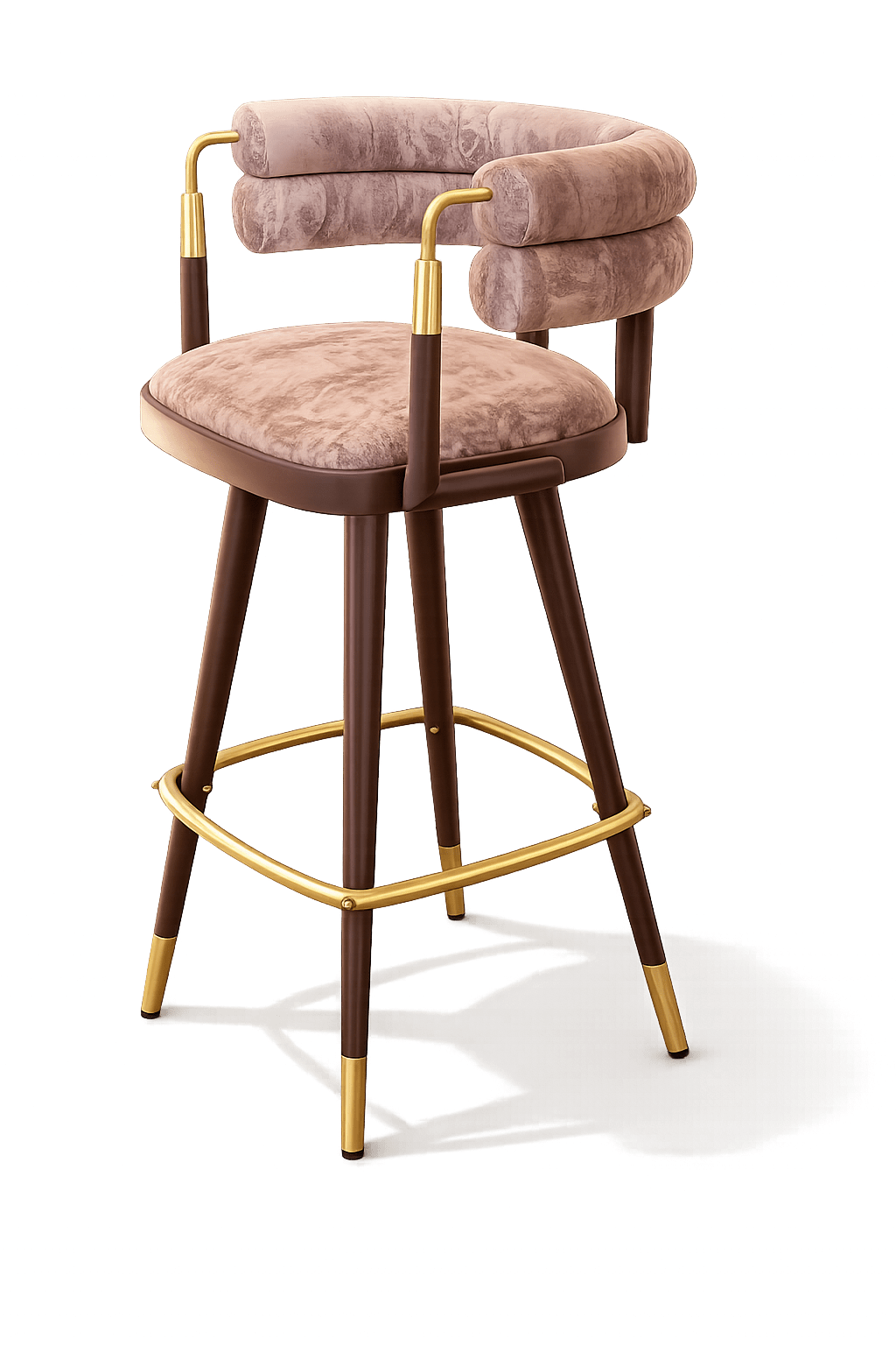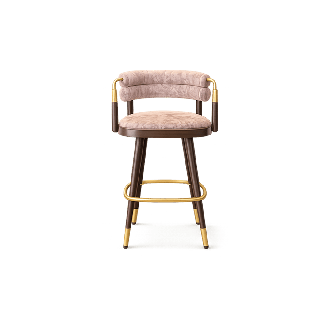 The Retro Glamour Barstool, showcases a timeless design with a captivating bent backrest, offering an open and airy allure. The sleek tapered charcoal legs with brass caps and squircle-shaped footrest enhance the luxurious design. Plush ivory upholstery adds modern sophistication to the overall aesthetic.