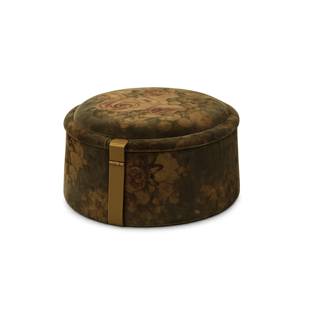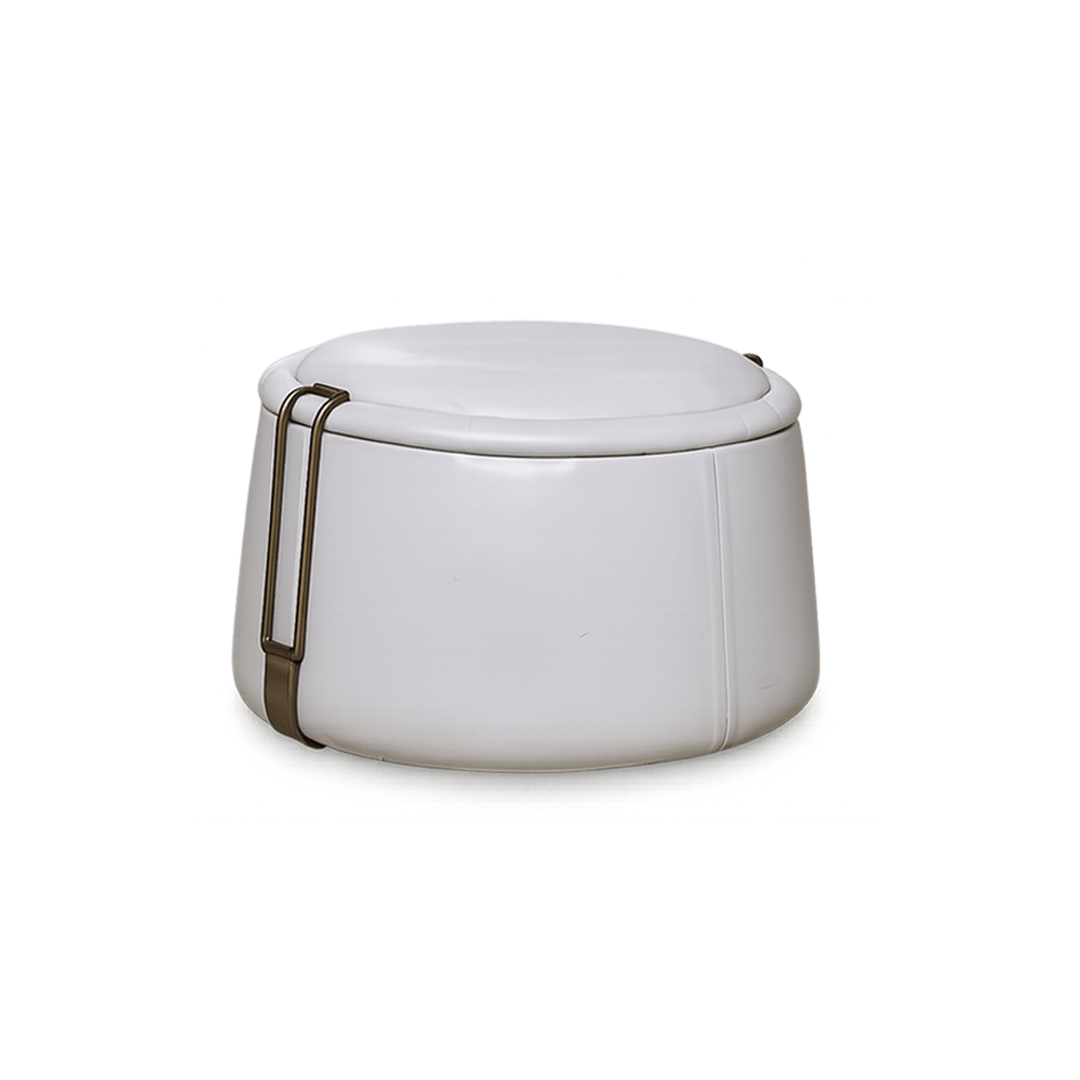 Inspired by the dabbas or tiffin boxes, this IndiGenius designed single tier tiffin pouf has storage space. It is upholstered in leatherette and MS trims reminiscent of Tiffin clamps.